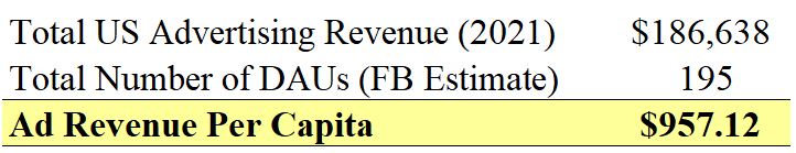 We can comfortably make the blanket assumption that Facebook’s numbers for daily active users for the US (195mm) are representative of the US population taking part in the data economy covered by the companies above. That’s ~60% of Americans, which makes sense when you consider ~50mm Americans are under 11 years old and ~80mm are over 60.