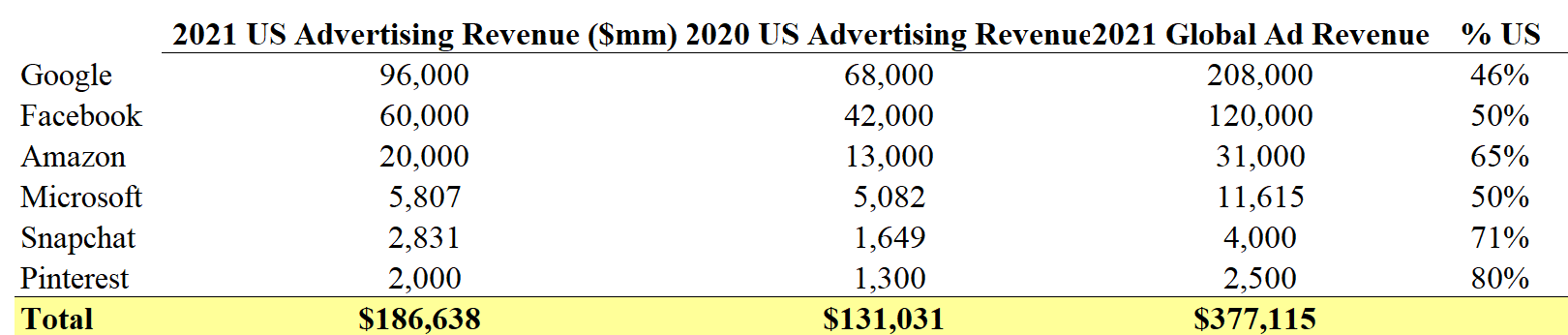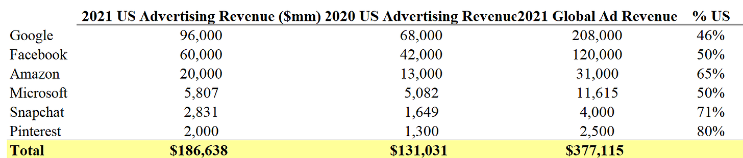 If the common person could distribute and contextualize their own data, they’d supplement their income significantly. But how much is that data worth? One simple approach is to look at the advertising revenue generated by America’s biggest tech companies - they capture the lion’s share of our personal data across every aspect of our physical and digital lives.