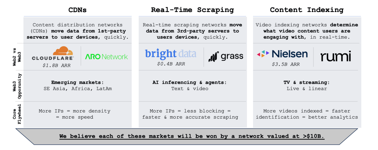 Scraping networks like Grass use edge nodes to scrape the web at scale and resell access to web content to AI model developers for training and inference.